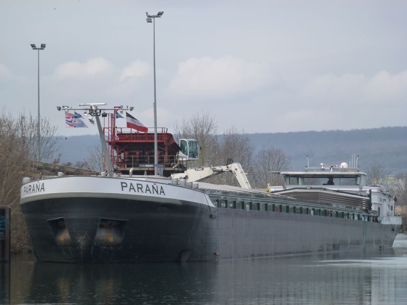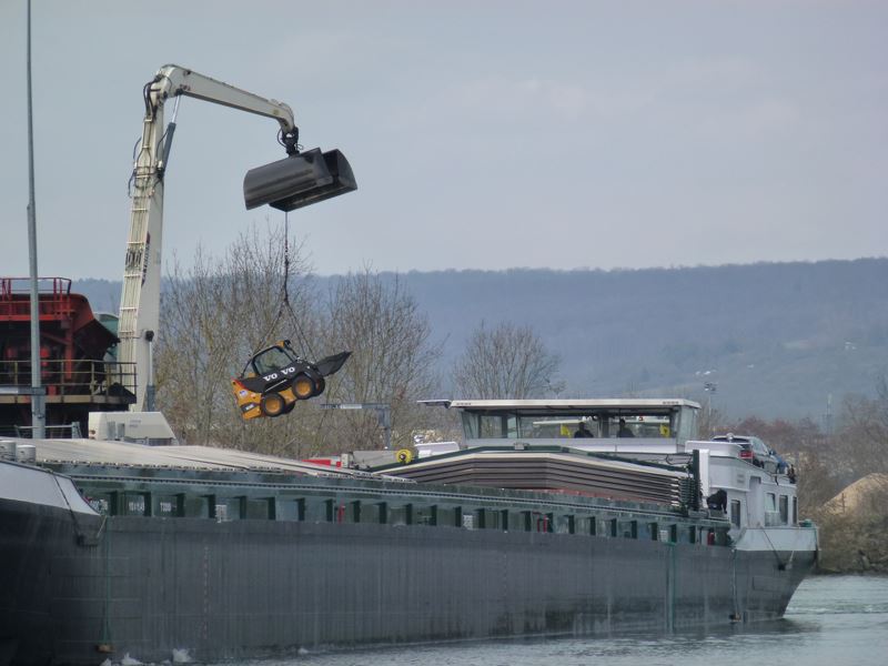 Fin de déchargement de charbon à la centrale électrique de Blénod-les-Pont-à-Mousson, puis entrée dans l'écluse à quelques dizaines de mètres :
