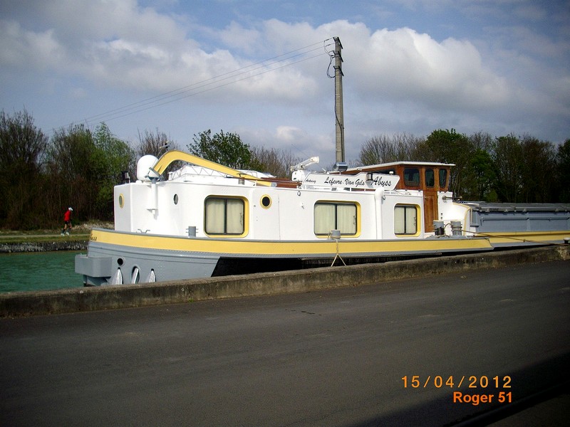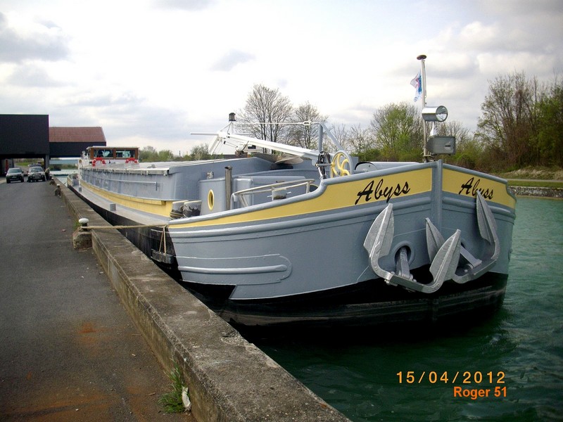 Abyss , 38,85 x 5,08 x 2,36 , 351 ton , Bouwjaar 1957 , Werf Michot Fréres in Thuin ( Belhie ) , 230 pk Detroit , ex Petite Reine , ex Isotope , eigenaar C. Levèvre in Antoing , ENI 06001608