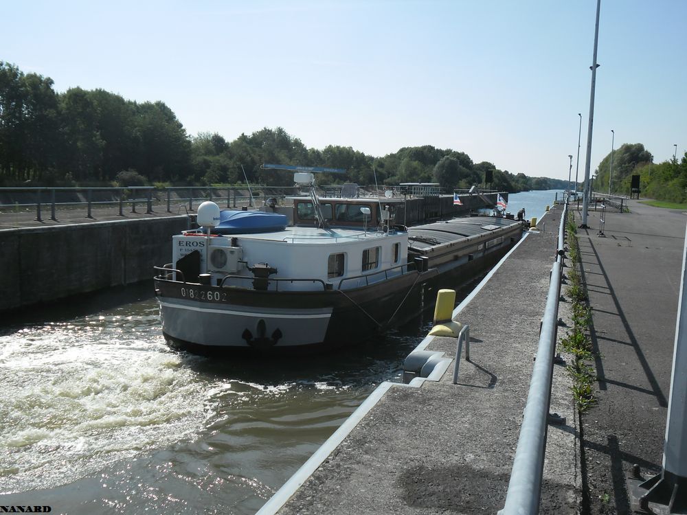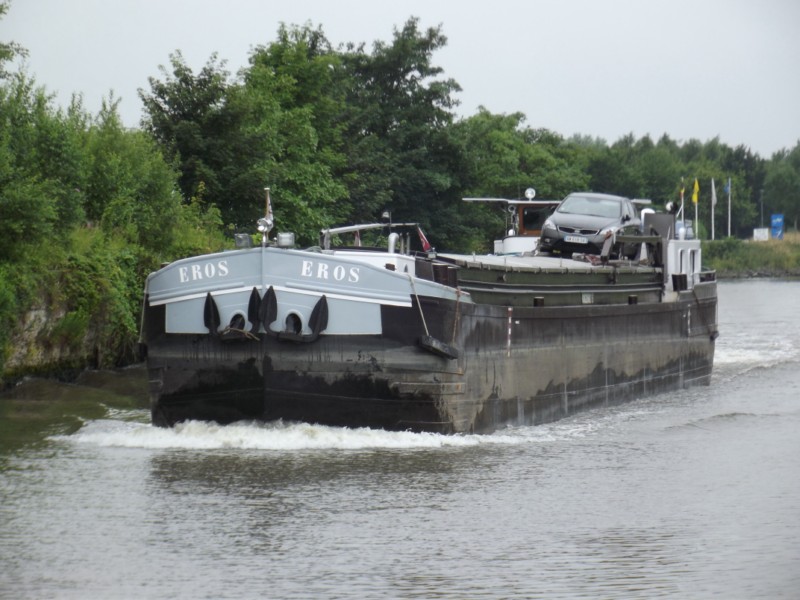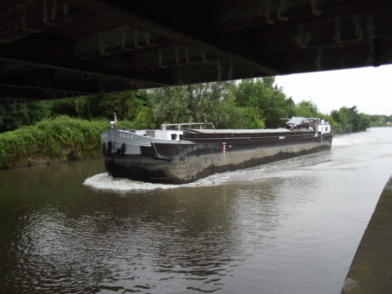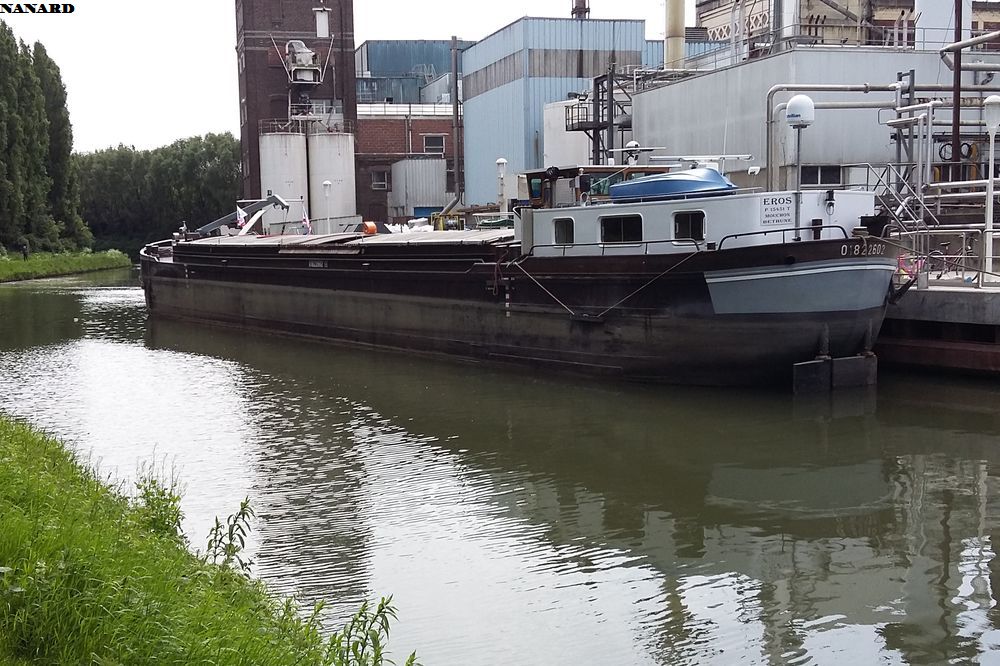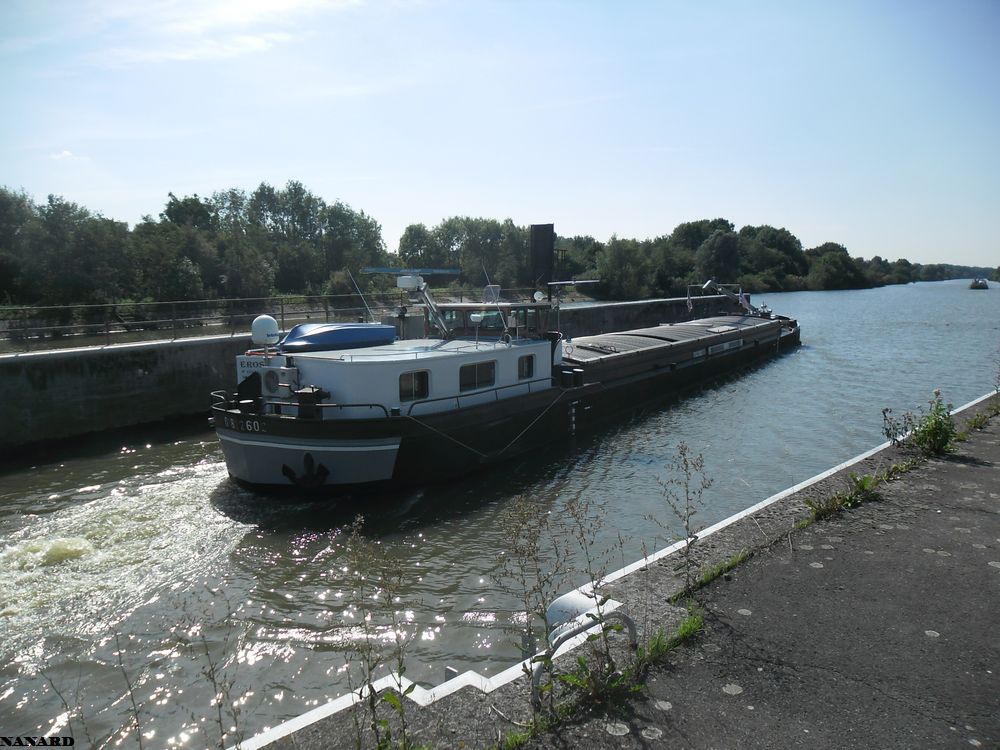 EROS en navigation sur la Marque canalisée à vide et en marche arrière ; sur la première photo, il vient de quitter l'usine Lesaffre de Marcq-en-Barœul (59), et sur la deuxième il est dans l'écluse de Marquette, la seule qu'il franchit sur le petit gabarit sur ce service :