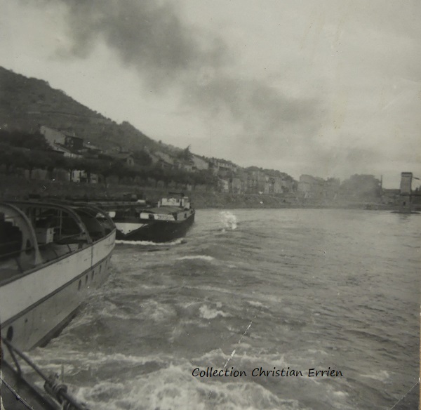 * Je ne me prononcerai pas sur le remorqueur descendant car je ne retrouve pas les arceaux du MASSILIA, qui avaient d'ailleurs plutôt en charge, les barques CITERNA, ni ceux du FREDERIC MISTRAL qui lui prenaient les barques CLNR (Compagnie Lyonnaise de Navigation et de Remorquage) telle la VALSERINE.