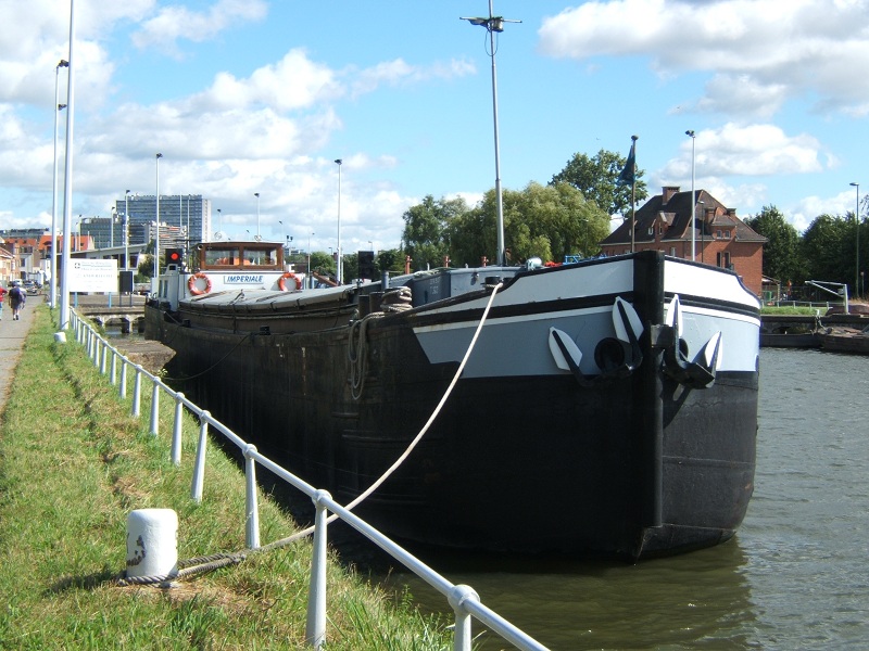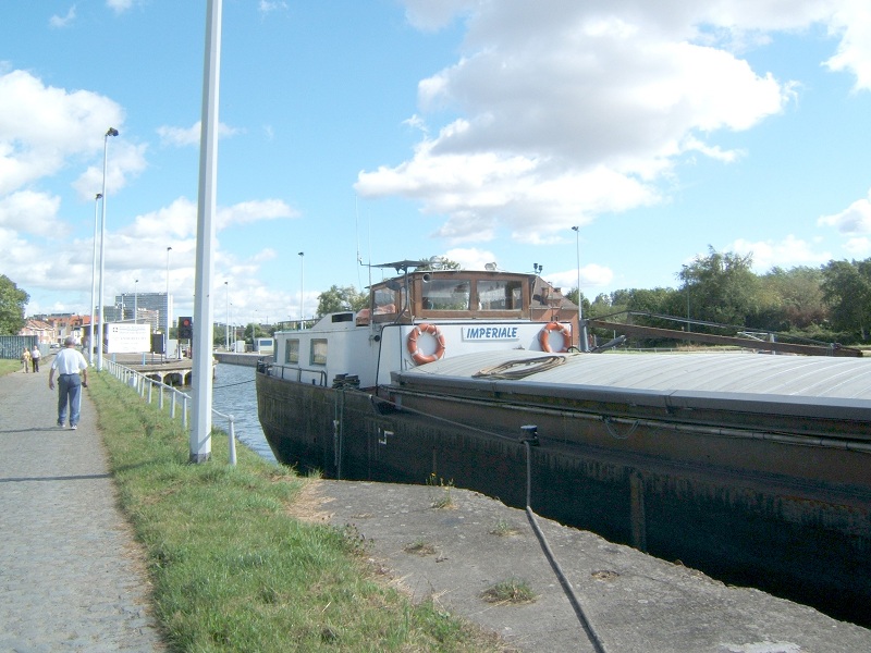 Comme le quai est un perré en amont de l'écluse d'Anderlecht et que rien ne protégeait les cornières qui frottaient sur le béton, un beau matin IMPERIALE prenait de la gîte . Voie d'eau rapidement et provisoirement colmaté. Parti vers un chantier ? pour réparation.