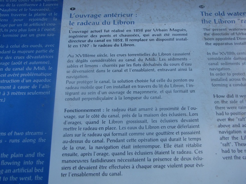 Bonjour j'aurais put mettre les photos suivantes dans plusieurs rubriques canaux ecluses barrages plaisances ponts mais la fonction premiere de cette ouvrage d'art est un barage le probleme de paul riquet a la constrution du canal du midi comment faire croisser un fleuve le libron 44klm de long caprisieux beaucoup de limon des debits eaux tres variable avec le canal la solution en images avec les explications