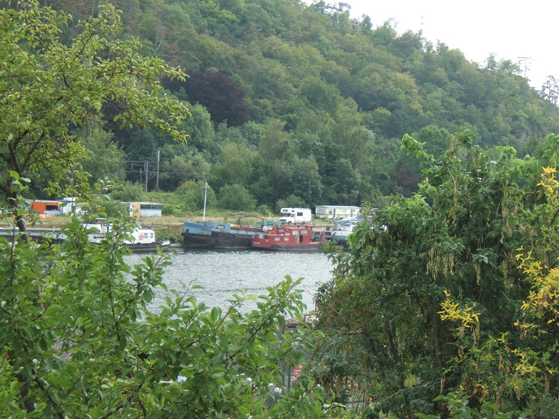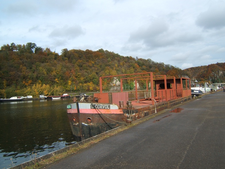 Le dimanche je suis souvent à Sclayn sur la Meuse. Pour le moment est amarré l'avant d'un 38m. coupé , le G. CORVOL pour transformation. Pas d'immatriculation ou autre détail lisible. J'ai appris par mon ami ,soudeur pensionné du chantier de Namèche, qu'il servira de ponton- terrasse pour un bateau événementiel garé au Grognon à Namur. L'arrière du bateau sera ou est déjà transformé en pousseur dans un chantier-atelier à quai à Namèche (rive droite)