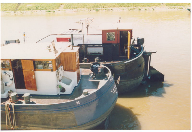 Au quai c`est le TIVOLI à W.J. v. Dosten, Meerkerk aux Pays-Bas, 39 x 5,08 m, 356 tonnes. Le numéro: on peut lire 133678. Le mât sur le TIVOLI: est-ce que c`est une première grue-voiture?