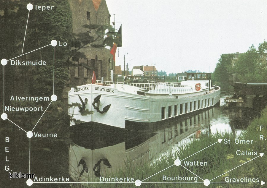 Carte postale éditée par l'office de tourisme du Westhoek (peut-être en 1987, d'après une date écrite imprimée au dos), sur laquelle on voit leur bateau-promenade :