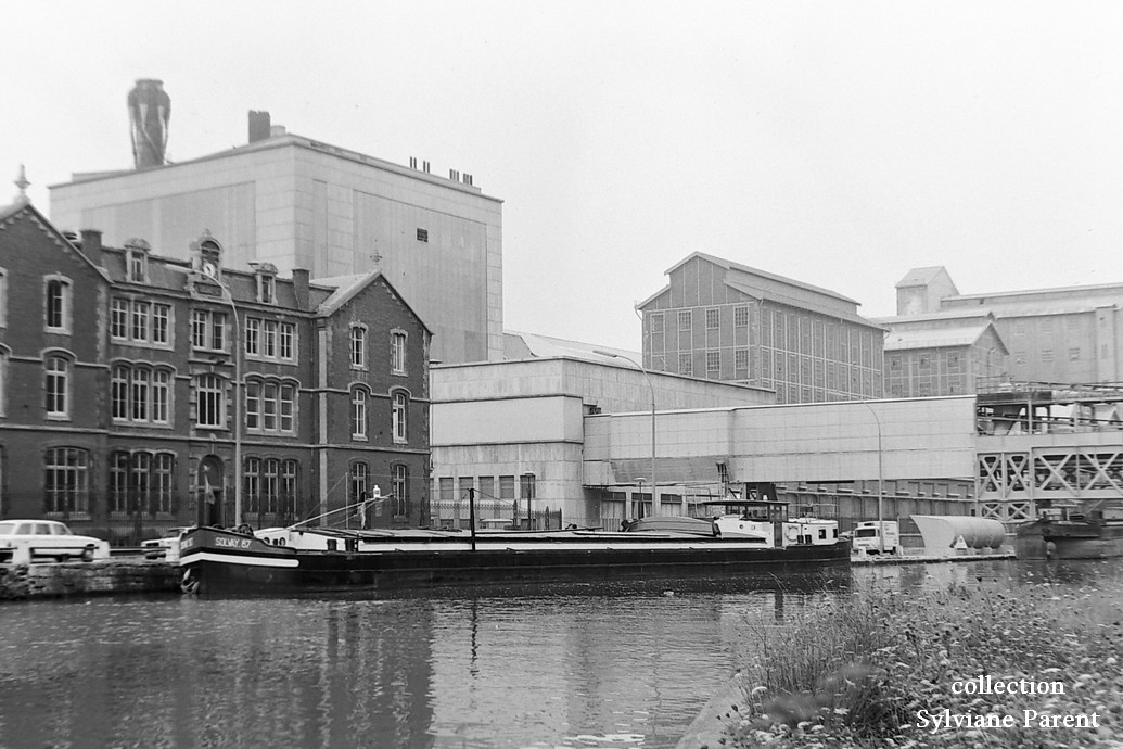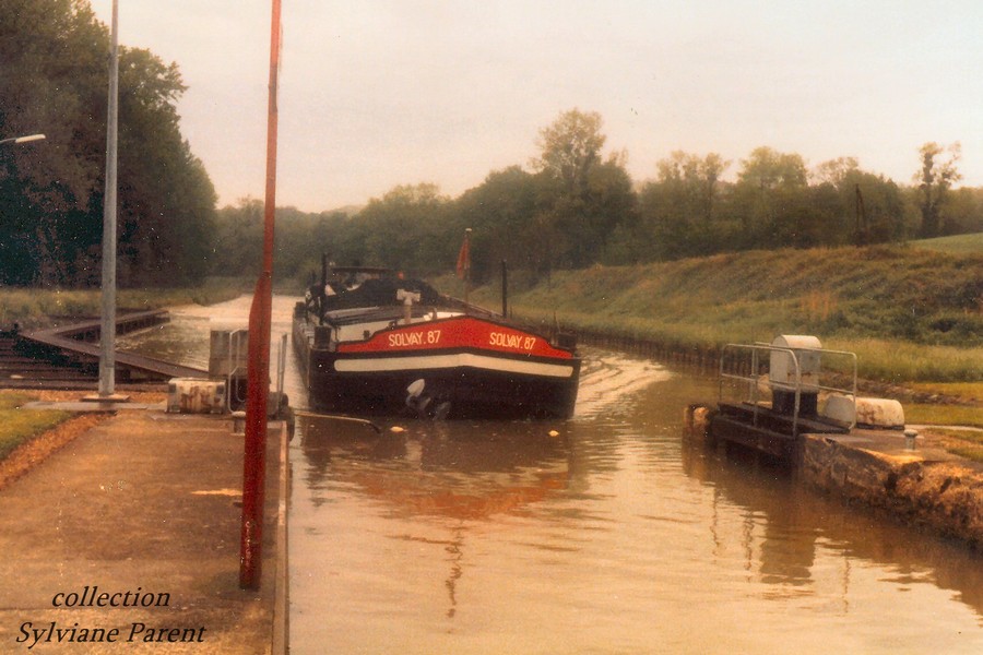 Deux photos du SOLVAY 87 amarré devant les grands bureaux Solvay à Dombasle, en 1980 :