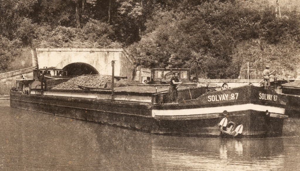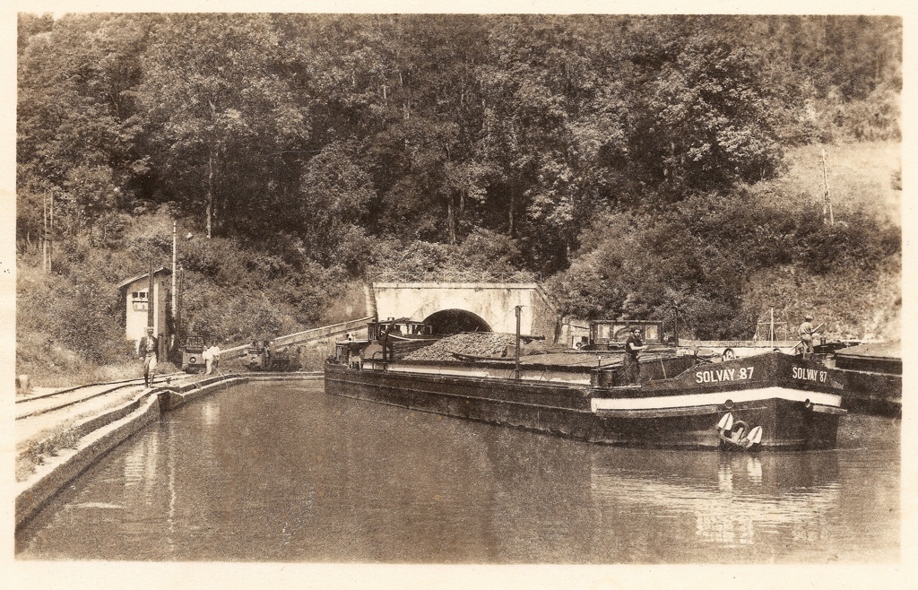 Deux photos qui nous permettent d'admirer la manoeuvre de sortie de la voûte de Foug réalisée par ce bateau construit aux Ateliers et Chantiers de Choisy-le-Roi en 1929 :