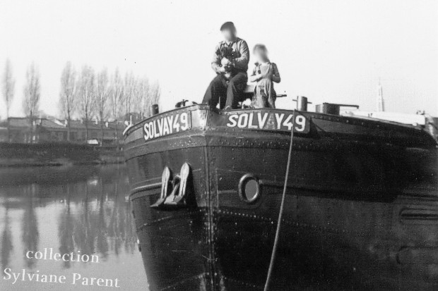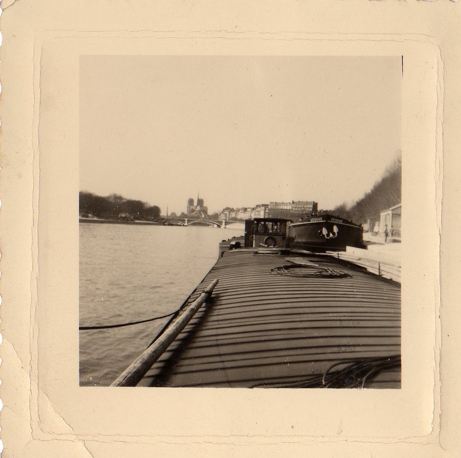 Le SOLVAY 49 avec le nez défoncé, après une collision avec le bateau MARLEINE dans l’île de Trilport, sur la Marne, en 1955 :