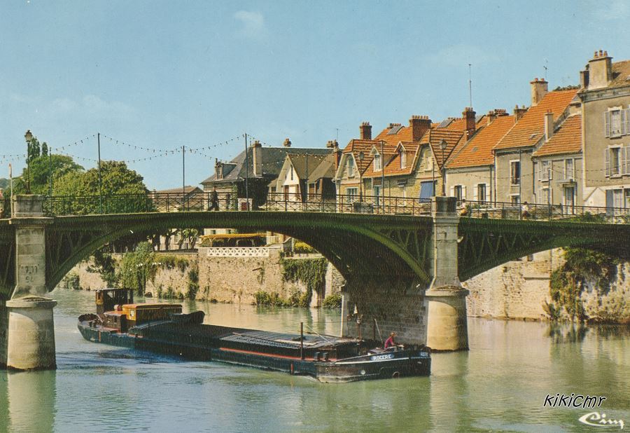 La Marne à La Ferté-sous-Jouarre, sur une carte postale (exemplaire écrit en 1973), avec un bateau qui a tout d'un marocain, sauf la devise :
