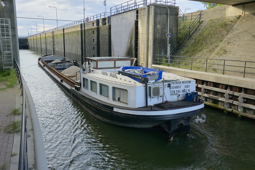 Il avait chargé du gravier à Trierveld, près de Born, pour Tilburg. Il est équipé, au milieu, d'un bras de grue pour se décharger.