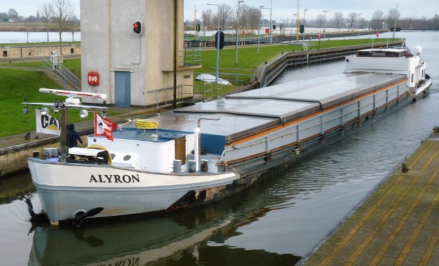 Alyron , 57,96 x 6,57 x 2,34 , 561 ton , Bouwjaar 1955 , Werf Hendriks in Dodewaard ( Nederland ) , 450 pk Caterpillar en 165 pk DAF – Kalkman boegschroef , ex Bergwijk , ex Fortuna , ex Aura , eigenaar Vostier in Liege , ENI 02004753