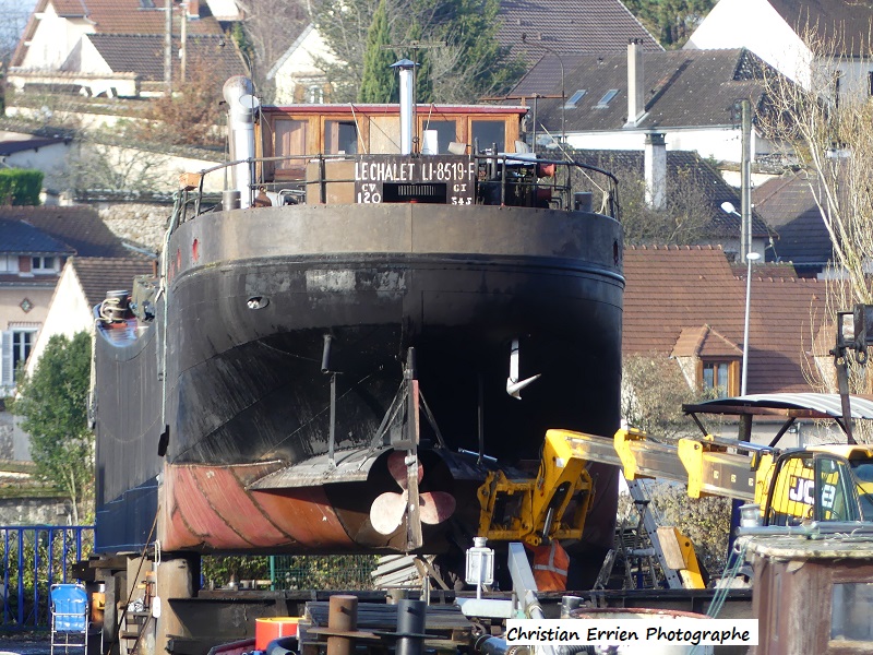 Le Chalet est revenu au chantier de Thomery pour effectuer les travaux préconisés en 2023. On voit bien le renforcement de la coque.