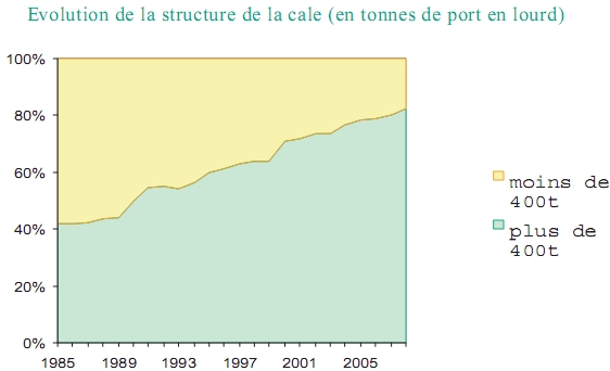 Avec près de 1400 bateaux, la flotte fluviale française offre une capacité d’emport de 1,14 million de tonnes. Le renforcement des grandes unités supérieures à 400 t) se confirme. Ces dernières représentent désormais plus de 90% de la capacité nationale de transport contre 50% en 2000. Cette modernisation de la cale rapproche la capacité moyenne des unités françaises (827 tonnes) de la moyenne européenne (1133 tonnes). La tendance est donc bien au renouvellement et à l’augmentation de la taille des bateaux. Sur ce point, l’année 2008 ne déroge pas à la règle avec l’arrivée, sur la Seine comme sur le Rhône, d’automoteurs géants pour le transport de conteneurs.