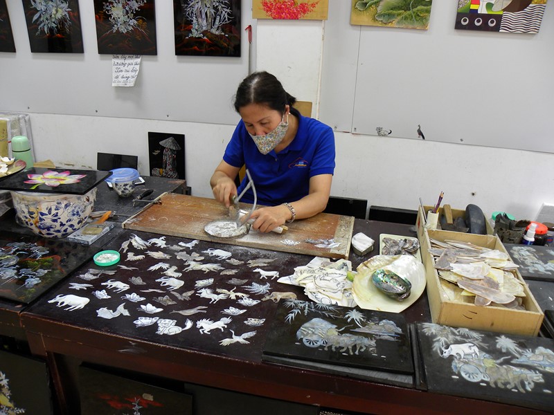 Nous avons visité un atelier de bois laqué, impressionnant le travail de ces Artistes.La responsable nous a dit : ici au Vietnam les fonctionnaires (tous corrompus du premier ministre au chien jaune) travaillent 5 jours par semaine et les autres personnes 6 ou 7 jours par semaine et 10 h par jour + 2 x 1,5 h pour les trajets.