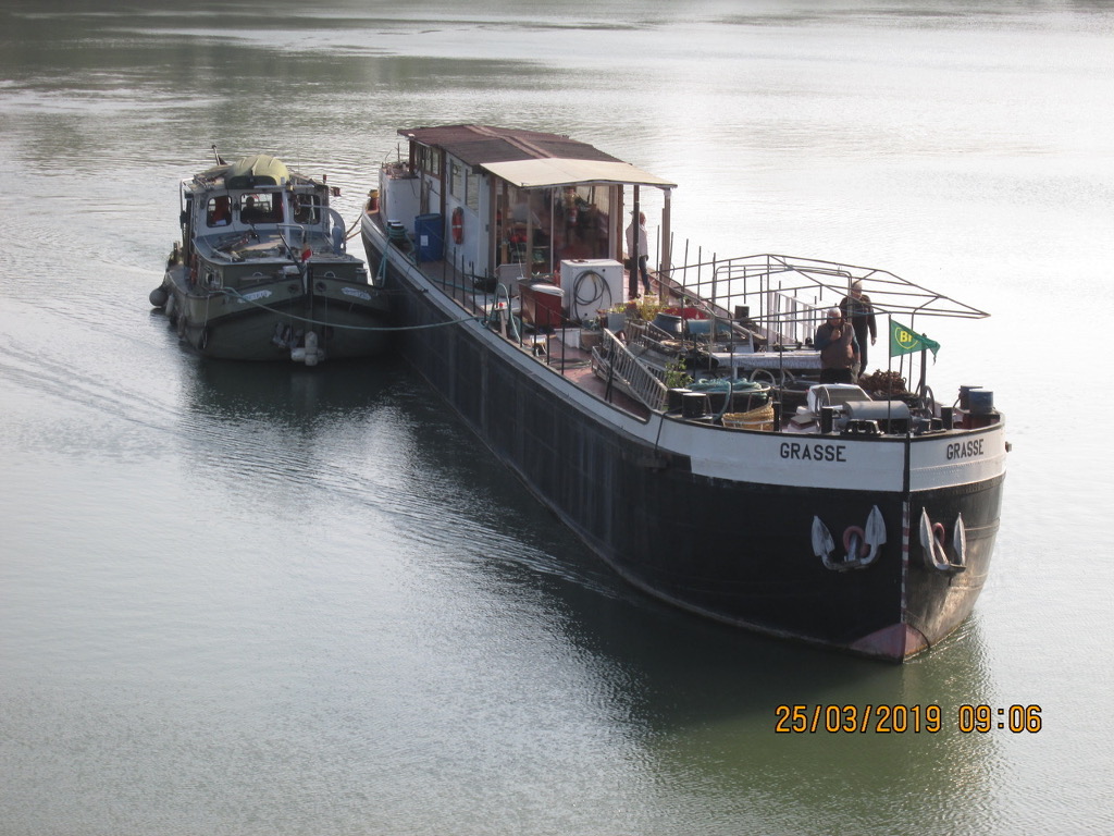En bateau logement qui stationne dans le canal d'Arles ,ici en route pour un carénage a Sète.