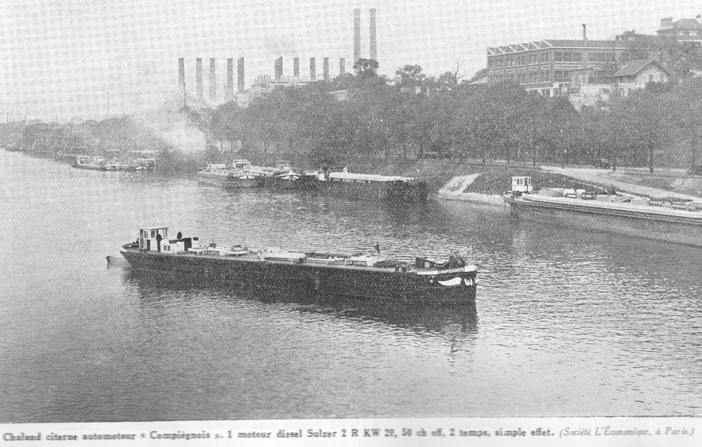 Article paru dans la revue Science et Industrie n°254bis - hors série Les voies navigables françaises - 1934, en illustration d'un article traitant de l'essor du moteur Diesel dans la navigation fluviale.