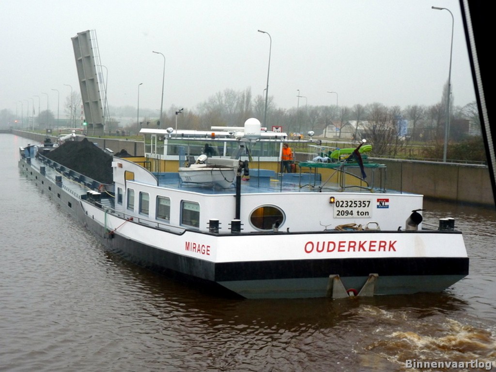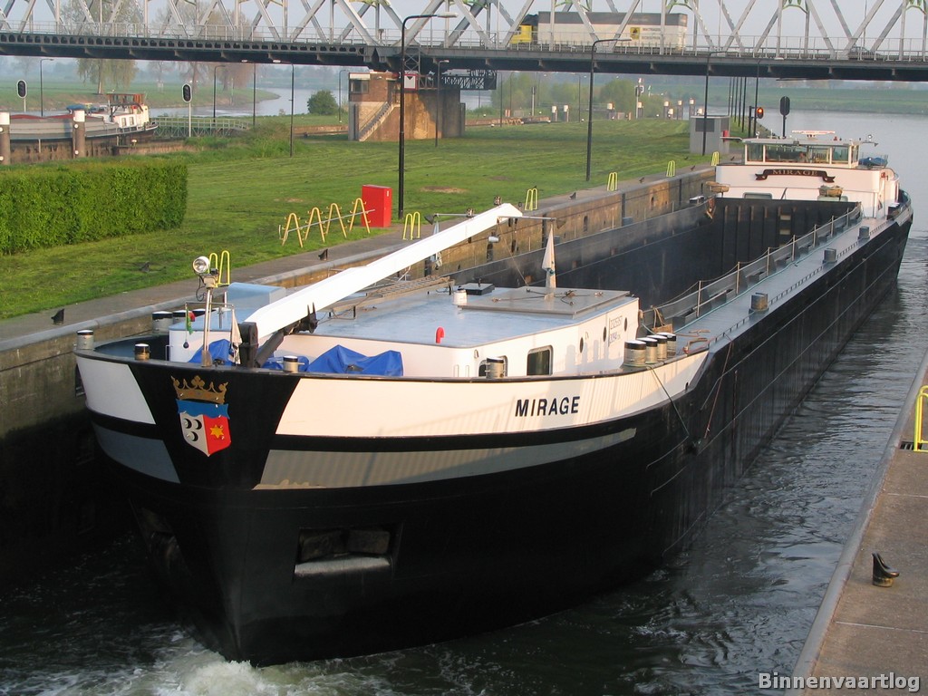 Mirage , 85,90 x 10,49 x 3,50 , 2094 ton , Bouwjaar 2001 , Werf Stocznia Malbo in Malczyce/Nowa Sol ( Polen ) en Joh. van Duijvendijk in Krimpen a/d IJssel ( Nederland ) , 1200 pk Cummins en 440 pk Cummins – van Wijk boegschroef , eigenaar Vof. Mirage (M. Heuvelman) in Ouderkerk a/d IJssel , ENI 02325357