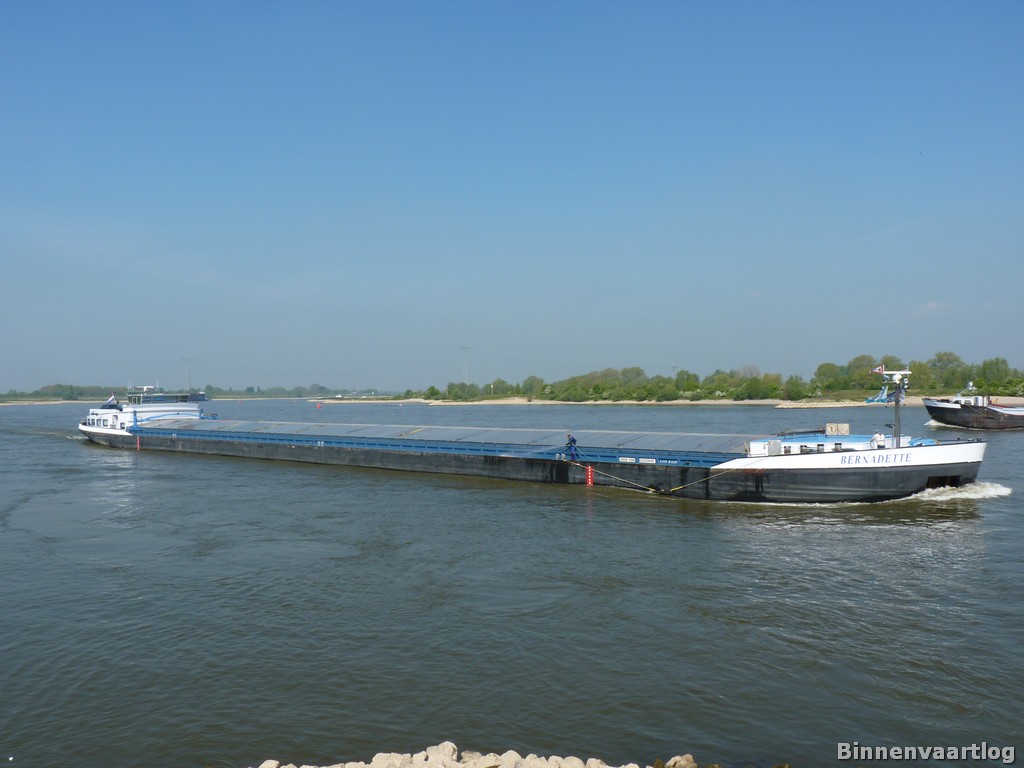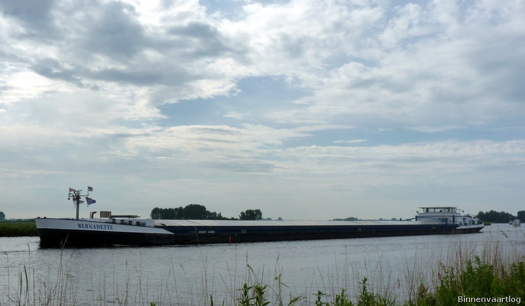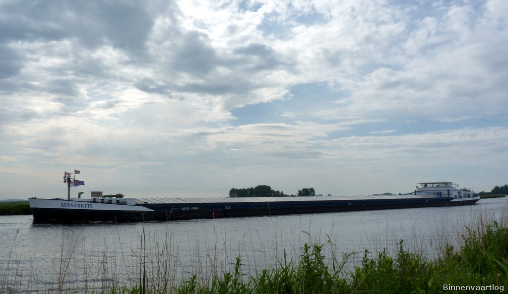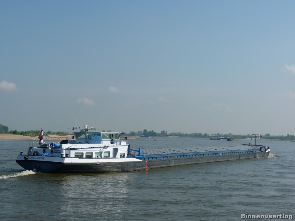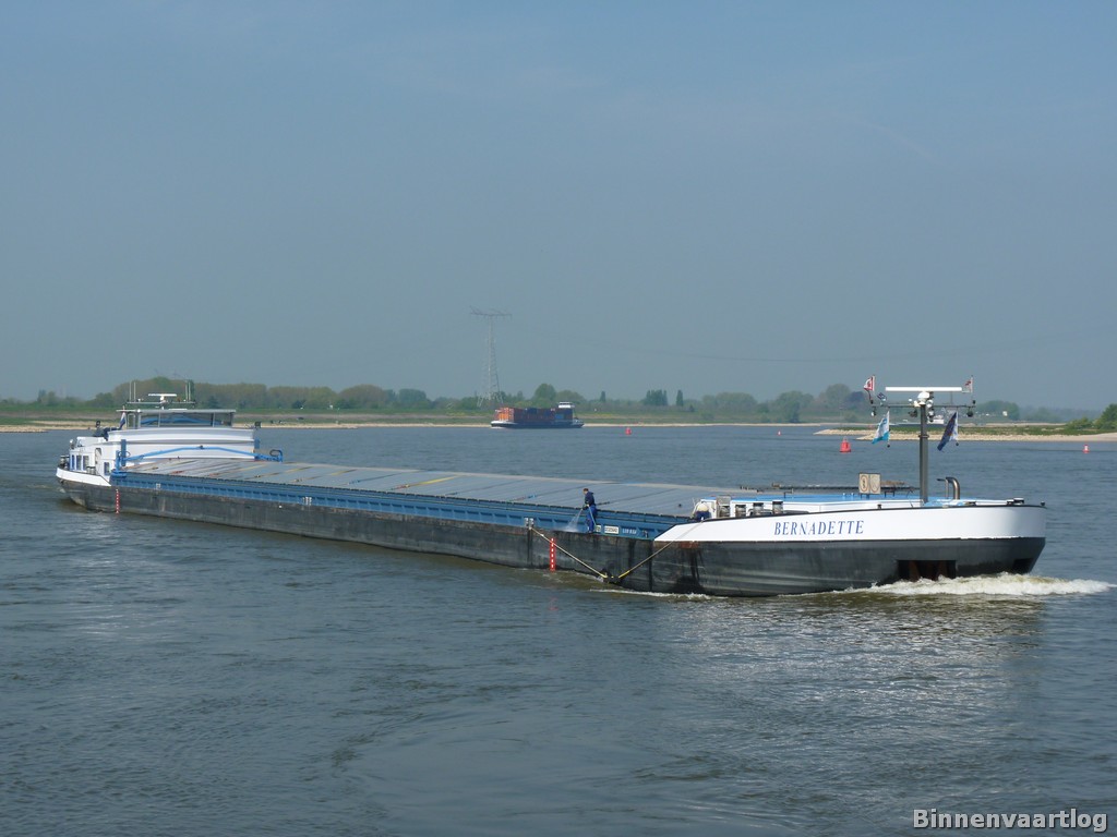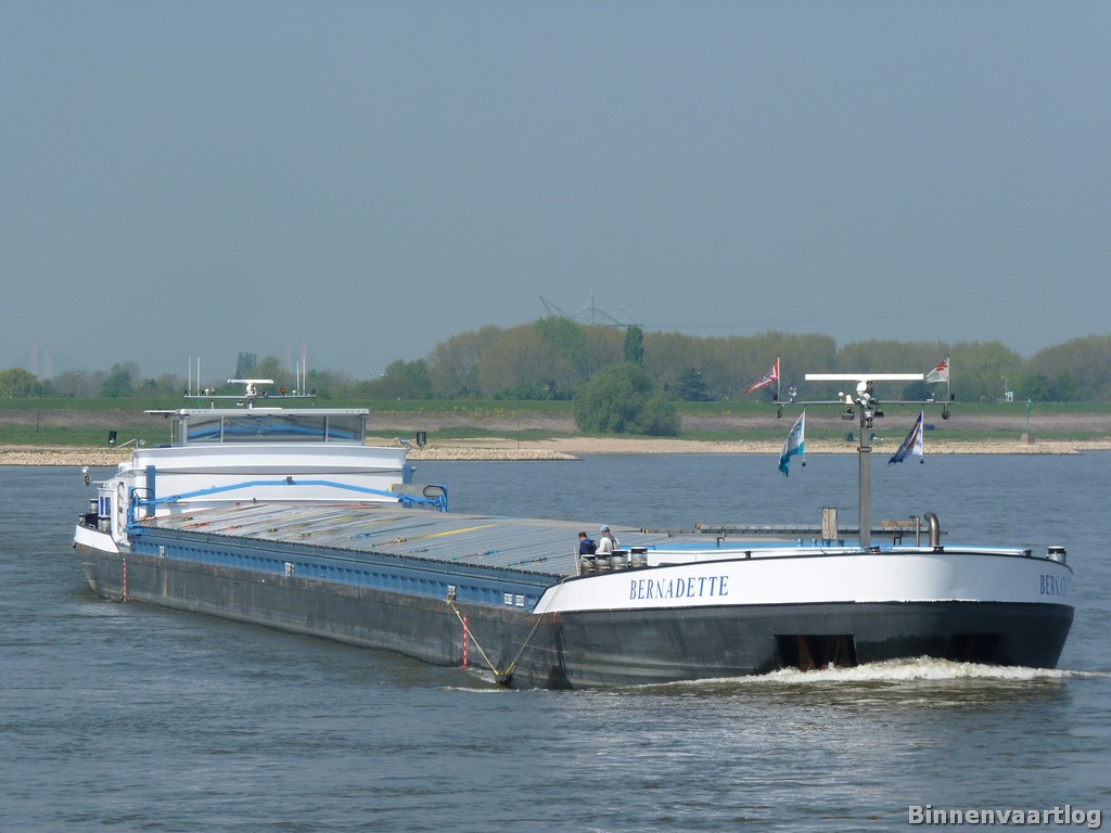 Bernadette , 110,00 x 11,45 x 3,45 , 3009 ton , Bouwjaar 2002 , Werf Centromost Stcznia Rzeczna in Plock ( Polen ) en De Gerlien – van Tiem in Druten ( Nederland ) , 1700 pk Mitsubishi en 791 pk MTU – van Tiem boegschroef , ex Bernadette , eigenaar Bernadette BV ( J.Pott ) in Nijmegen , ENI 02325642