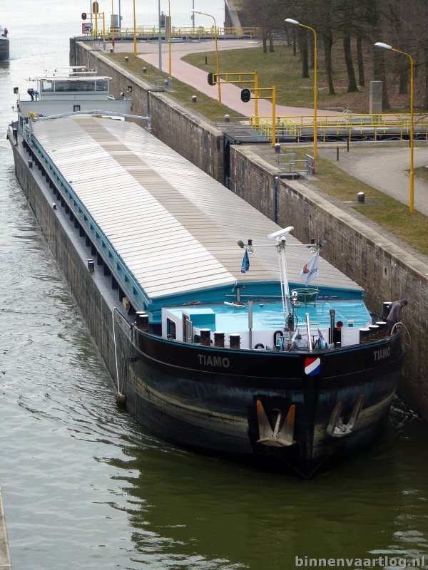Tiamo , 104,71 x 9,51 x 3,27 , 2280 ton , Bouwjaar 1973 , Werf Plocka Stocznia Rzeczna in Plock ( Polen ) , 1379 pk Caterpillar en 320 pk DAF boegschroef , ex Kempenland , ex Adriaan-J , ex Faial , ex 2 x Santina , ex Tiamo , eigenaar Vof. Scheepvaartbedrijf van Meel in Lith , ENI 02317735