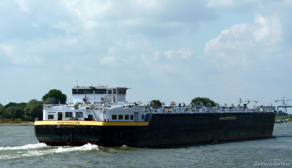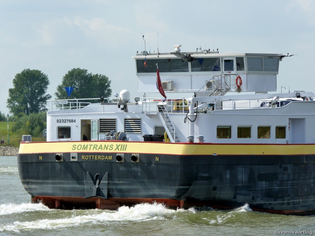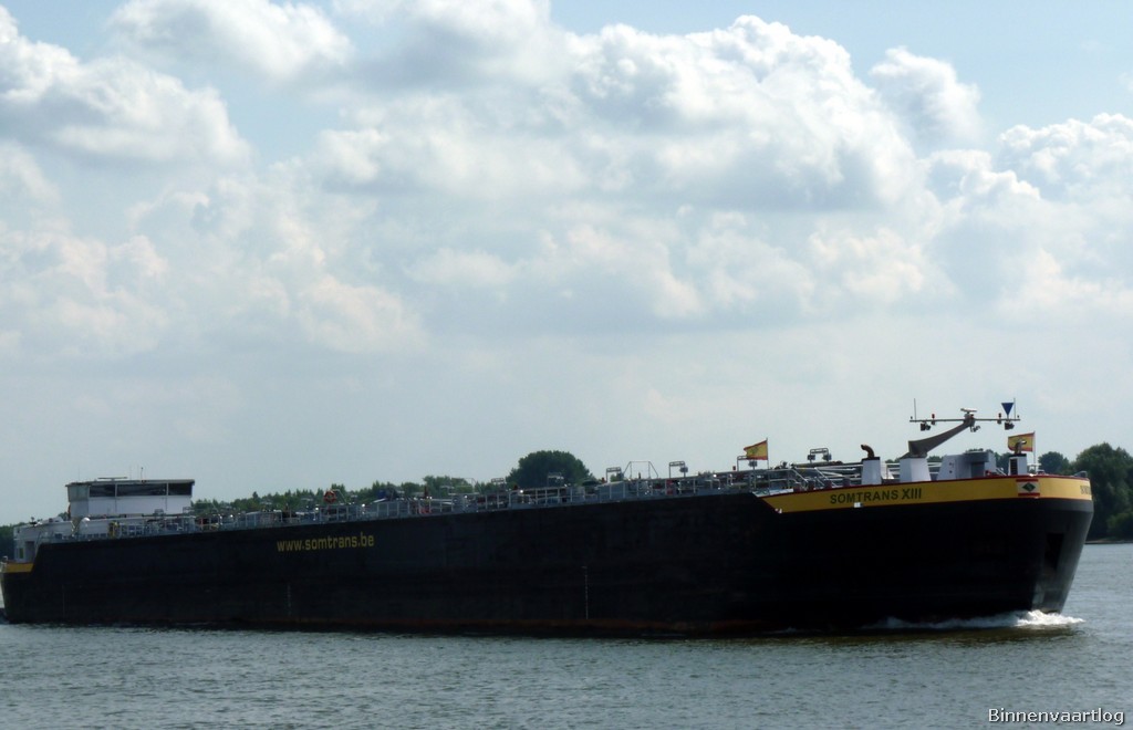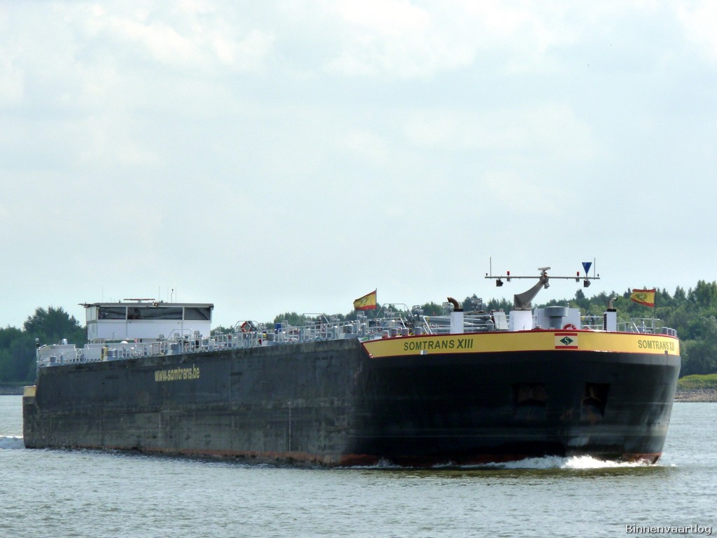 Somtrans XIII , 135,00 x 16,85 x 4,05 , 6610 ton , Bouwjaar 2006 , Werf Severnav SA in Drobeta-Turnu Severin ( Roemenie ) en Breko Nieuwbouw BV in Papendrecht ( Nederland ) , 3 x 800 pk MTU en 2 x 530 pk Cummins Veth-Jet boegschroef , eigenaar Somers BvbA in Rotterdam , ENI 02327684