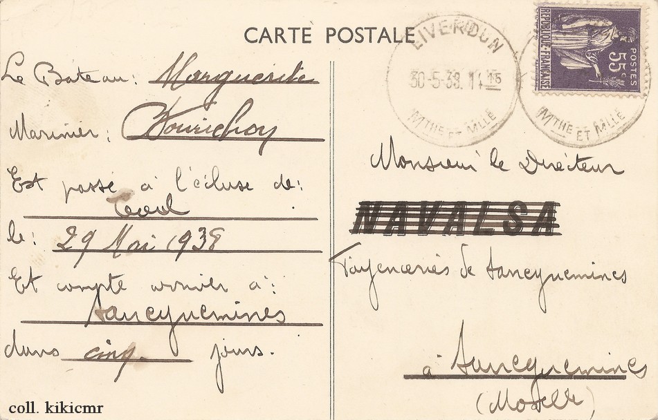 Le bateau MARGUERITE, marinier Bourichon (affrété par Navalsa ?), est passé à l'écluse de Toul le 29 mai 1938 et compte arriver à Sarreguemines cinq jours plus tard. Le timbre à date indique que cet avis de passage a été posté à Liverdun le 30 mai 1938, destiné à M. le Directeur des faïenceries de Sarreguemines.
