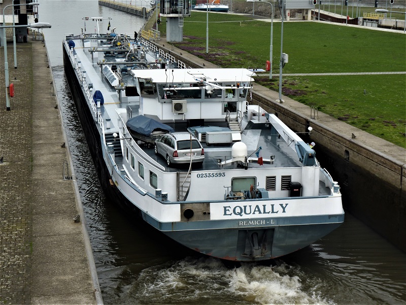 Equally , 105,00 x 11,45 x 3,40 , 2765 ton , Bouwjaar 2013 , Werf Bomex4M Shipyard in Zrenjanin ( Servië ) en TeamCo Shipyard in Heusden ( Nederland ) , 1700 pk Mitsubishi en 608 pk Caterpillar - Verhaar Omega-Jet boegschroef , eigenaar Amber Shipping International SA in Remich , ENI 02335593
