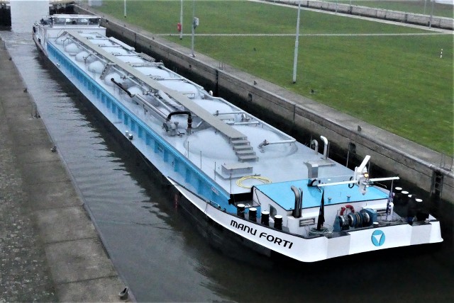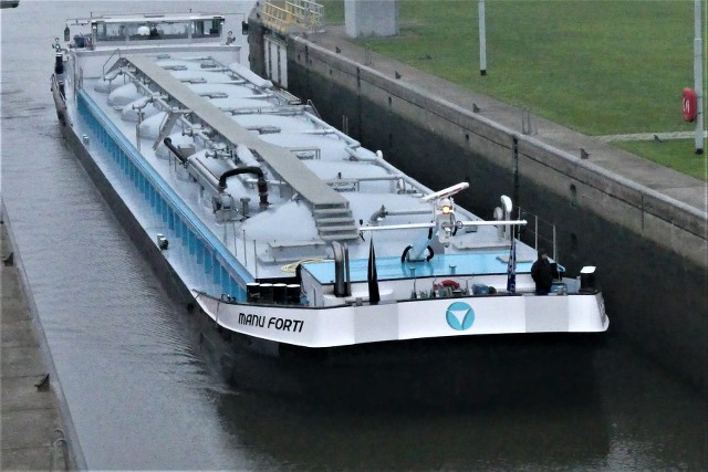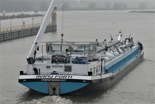 Manu Forti , 84,80 x 9,60 x ? , ? , Bouwjaar 2005 , Werf Leninskaya Kuznitsa Shipyard in Kiev ( Ukraine ) en Bodewes in Millingen aan de Rijn ( Nederland ) , 1000 pk Cummins en 530 pk DAF – Ballegooy boegschroef , ex Amira , ex Iris , eigenaar Carpe Diem Shipping in Papendrecht , ENI 02327263