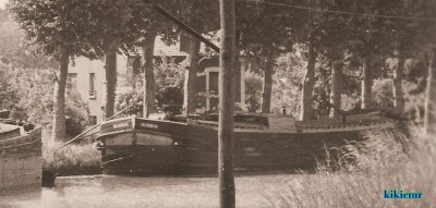 Sur une carte postale de Vitry-le-François non datée, amarrée à l'arrière-plan, une péniche dont la devise est lisible au compte-fil :