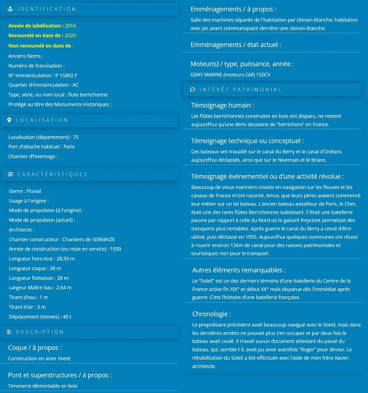 Le SOLEIL - P15892F - a été labellisé PATRIMOINE MARITIME ET FLUVIAL en 2019, renouvelé en 2016, renouvelé en 2020.