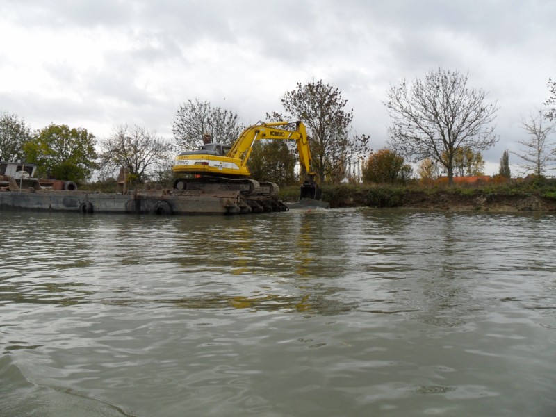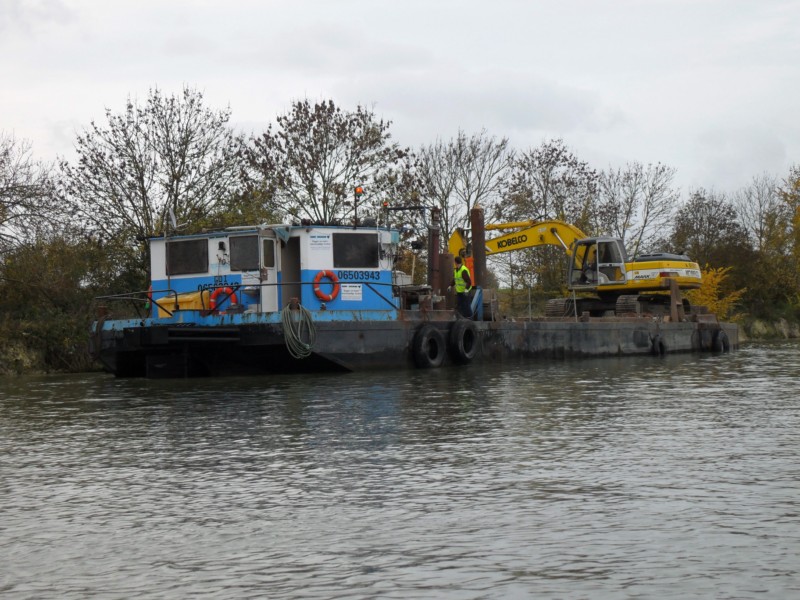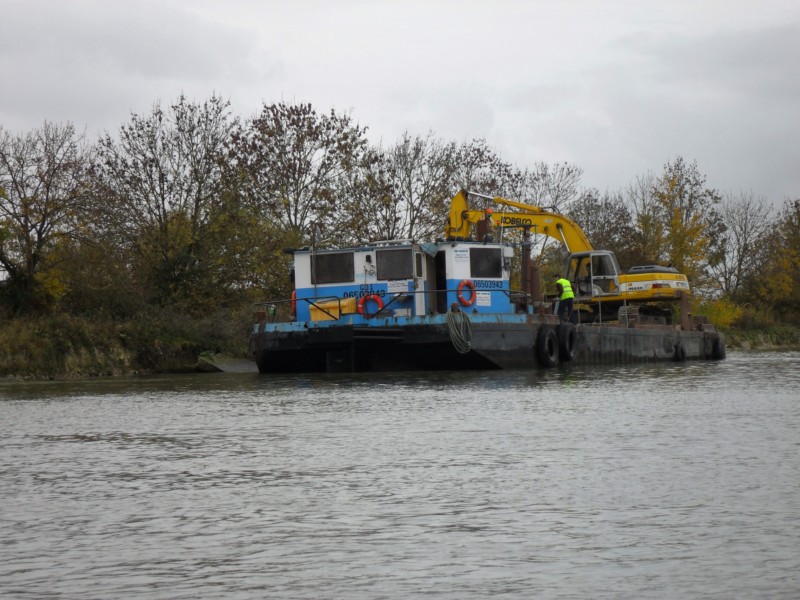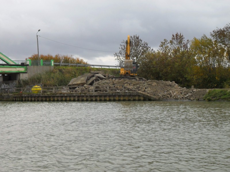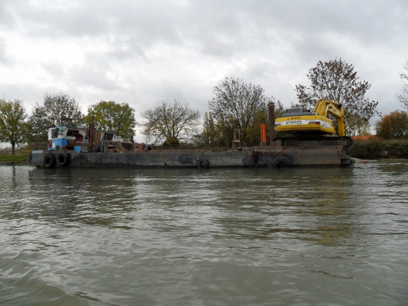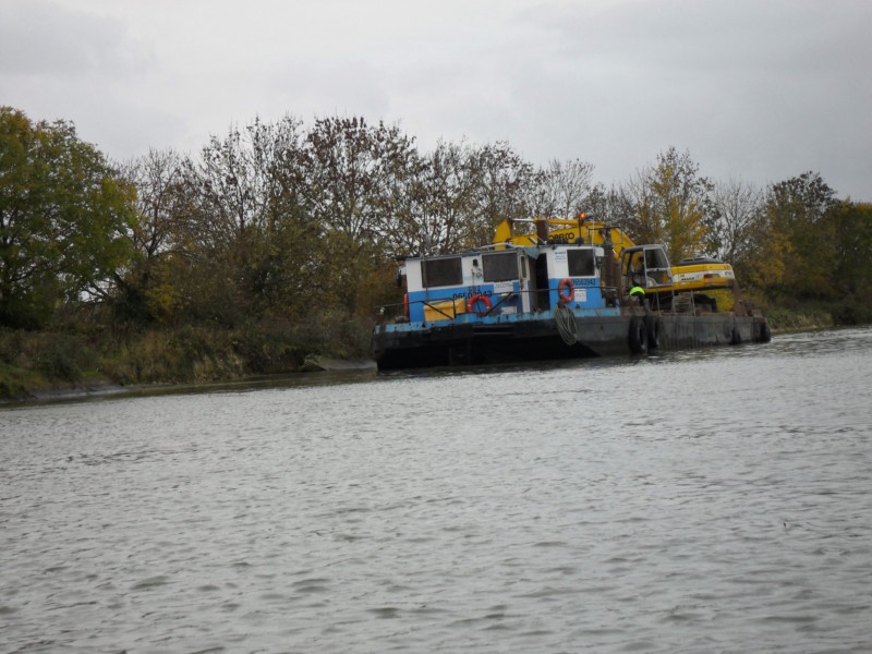 Je vous presente ce bateau en pleine action!! il s'occupe de retirer les enormes blocs de béton mal en point des rives du canal pour les remplacer par de gros rochers qui permettront au chemin de halage de ne pas se retrouver euh ben dans le canal lol.