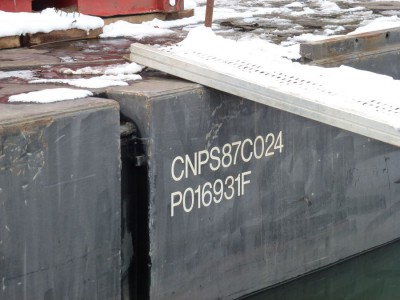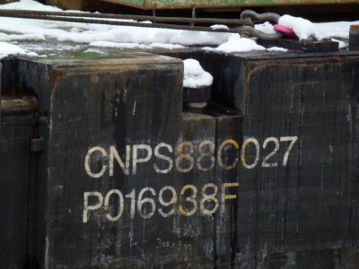 Devant le pousseur, il y a une grue sur un ponton flottant... ponton flottant formé de plusieurs caissons... caissons avec devises et matricules ! Si, si !