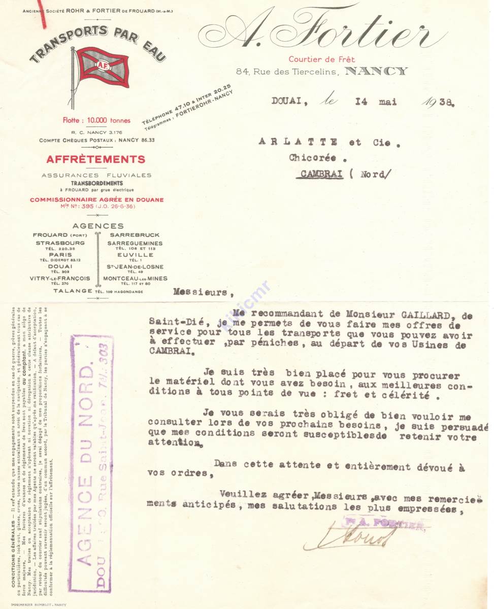 Une lettre datant de 1938, émise par l'agence de Douai de la société A. Fortier (transports par eau, courtier de fret, assurances, commissionnaire en douane) dont le siège est à Nancy, à destination de l'entreprise Arlatte et Cie, fabricant de chicorée à Cambrai :