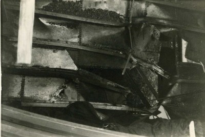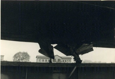 L'accident était dû à un mauvais positionnement des crochets d'élingues (des chaines) qui ont glissé, le paquet de tôles est tombé sur un coin, ça avait découpé le fond comme avec un ouvre-boîte. Pour ce qui est de la brèche, je me souvient qu'une fois le Vixit à terre,bras écartés les mains ne touchaient pas les deux extrémités de la brèche.
