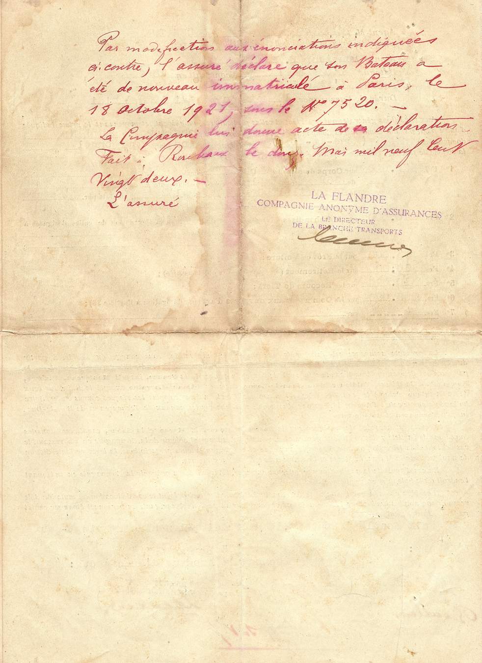 C'est écrit : "Par modification aux énonciations indiquées ci-contre, l'assuré déclare que son bateau a été de nouveau immatriculé à Paris, le 18 octobre 1921, sous le n° 7520.