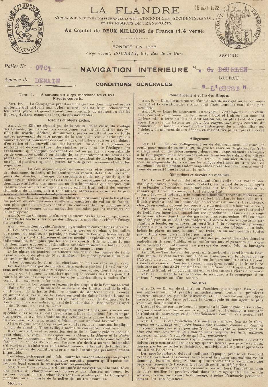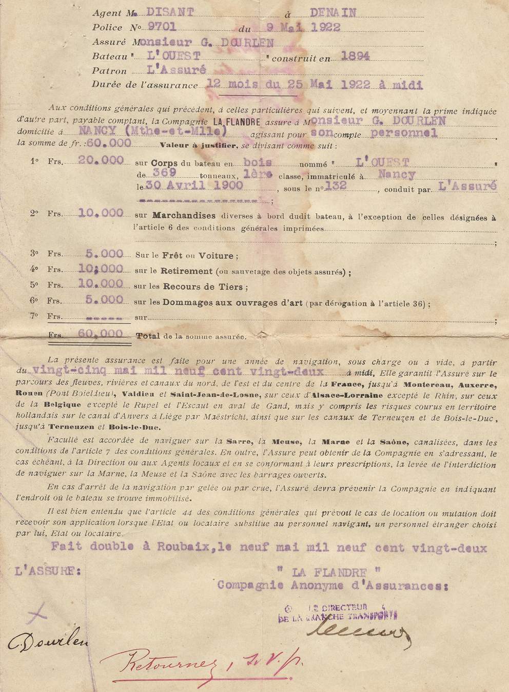 Un peu de lecture... les conditions générales d'assurance du bateau "L'OUEST" à G. Dourlen, de Nancy, auprès de la compagnie La Flandre, en mai 1922 :