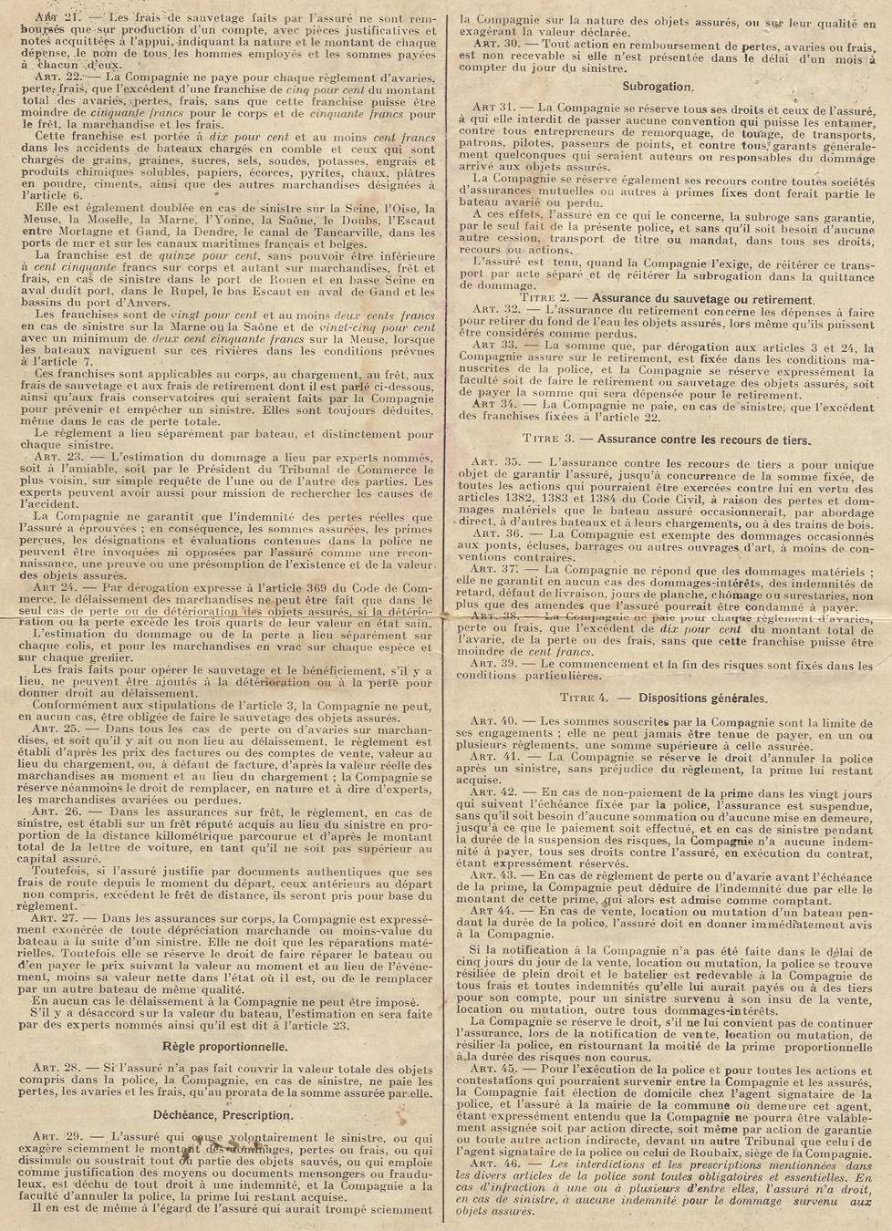 - des notions de géographie dans l'article 7 : "La compagnie est exempte des risques de la Somme en aval de Saint-Valéry ; de la basse Seine en aval des limites aval de la ville de Rouen ; de la haute Seine en amont de Montereau ; de l'Yonne en amont d'Auxerre ; de la Saône en aval de Saint-Jean-de-Losne et Saint-Symphorien ; du Doubs et du canal en aval de Valdieu ; de la Loire ; de la Sarre canalisée en aval de Louisenthal ou Ensdorf ; du Rupel et de l'Escaut en aval de Gand.