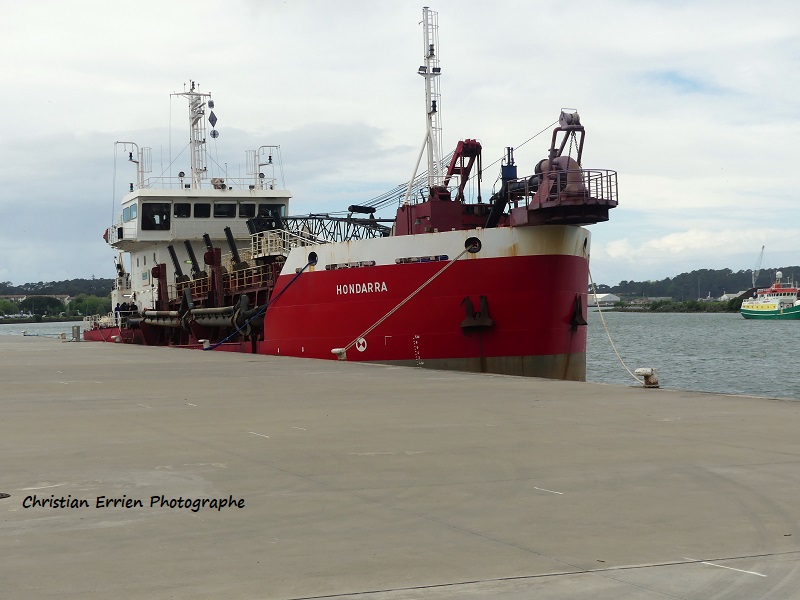 HONDARRA signifie sable en Basque. Le bateau a été construit en 2015 (sept) au chantier Astillero de Mureta en Espagne. Ses dimensions sont 62m30x 13m40 /1495t et un tirant d'eau de 4m60.