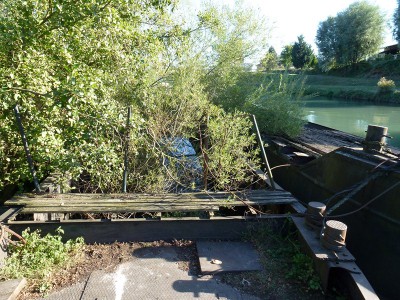 En aval de l'écluse du Rhin de Volgelsheim (68), qui donne accès au canal de Colmar, on trouve quatre barges dont l'une sert de ponton d'attente et d'embarquement pour un bateau à passagers :
