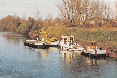 Et il se trouve que dans Fluvial n°72 (janvier / février 1995), on trouve un article sur des travaux réalisés sur ce canal, avec une photo qui montre des dragages avec utilisation de ce genre de barges :