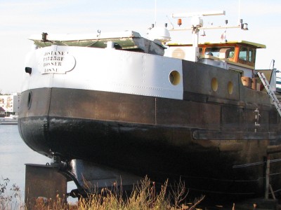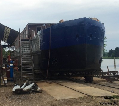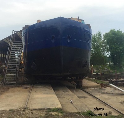 Actuellement au chantier à Saint-Jean-de-Losne, il a déjà bien changé et se transforme en bateau-hôtel ! (photos transmises par Yohann M.)