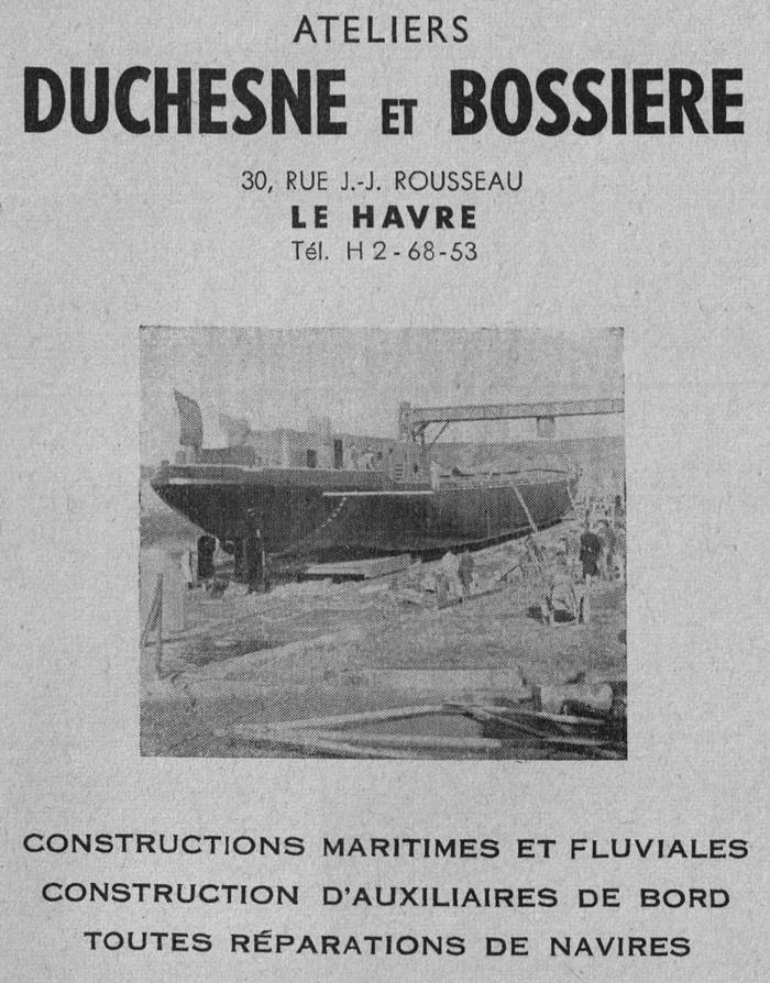 Une pub pour les Ateliers Duchesne et Bossière avec un canadien en construction, tirée de la Revue de la Navigation intérieure et rhénane du 25 avril 1952 :
