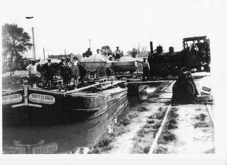 une petite loco à vapeur montait à bord pour tirer des berlines chargées de matériaux.