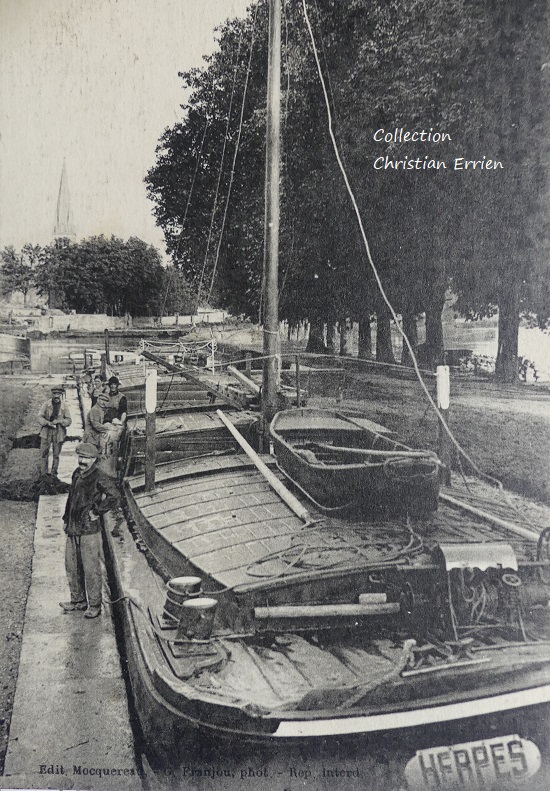 Voici une très jolie carte postale des années 20 prise à Tours sur Marne. Gros plan sur le bateau HERPES