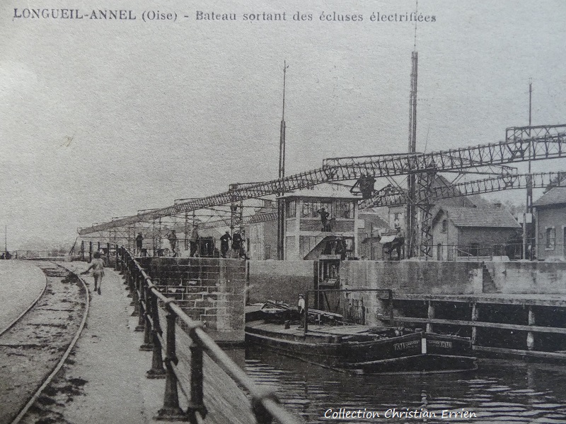 Voici une cpa de Longueil Annel montrant une péniche le CAZA sortant de l'écluse; la manoeuvre se fait à l'aide d'un charriot pour accélérer le mouvement