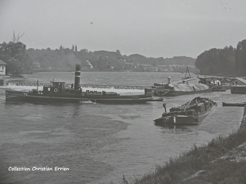sur cette carte des années 20 on voit un bateau en mauvaise posture à la sortie de l'écluse de la cave. Sa devise n'est pas lisible sur la carte sauf que j'ai trouvé une carte photo indiquant que ce bateau se nomme VLINDER ce qui signifie papillon en Neerlandais. La première flûte HPLM derrière le remorqueur est le SERBE. Le remorqueur n'est pas nommé