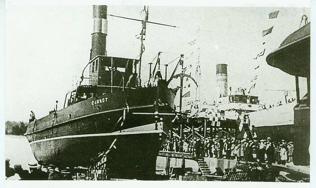 Trois bateaux en construction à Le Trait, en premier plan les remorqueurs "Carnot" et "Richelieu" en construction pour ???, tous les deux lancés 08.08.1926, en arrière-plan le pétrolier "Le Loing" pour la Marine nationale.