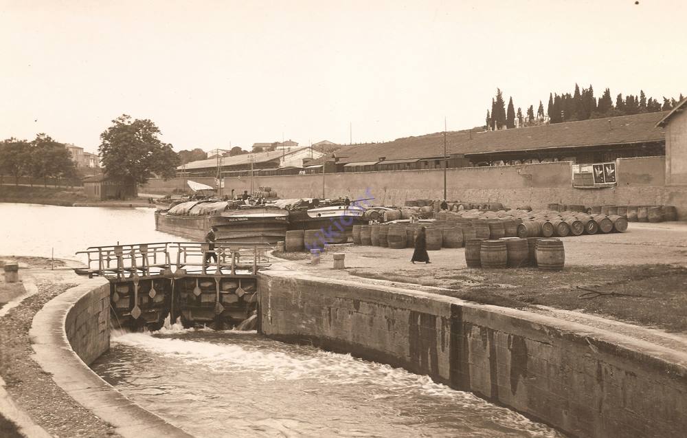 Une légende manuscrite au dos de l'image me permet de localiser le lieu : "Carcassonne - Schleuse im Kanal du Midi". Oui, c'est vrai, c'est de l'Allemand, mais c'est encore de mon niveau ! ça doit vouloir dire : "Carcassonne - Écluse sur le canal du Midi"...