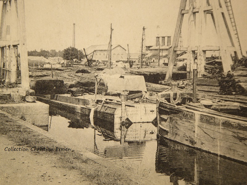 Cette photo est prise précisément sous le portique qui jouxtait l'écluse du Bois-Bretoux, qui permettait au port Schneider de communiquer avec le canal, au niveau du port de bois-Bretoux,au-dessus du bief de partage. On reconnaît à l'arrière-plan les fours à chaux du port Schneider.