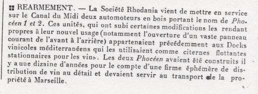 en 1942 sont reconstruit pour la Société Rhodania deux citernes flottantes stationnaires pour les vins comme automoteurs pour le Canal du Midi, nouveaux (??) noms "Phocéen 1" et "Phocéen 2".
