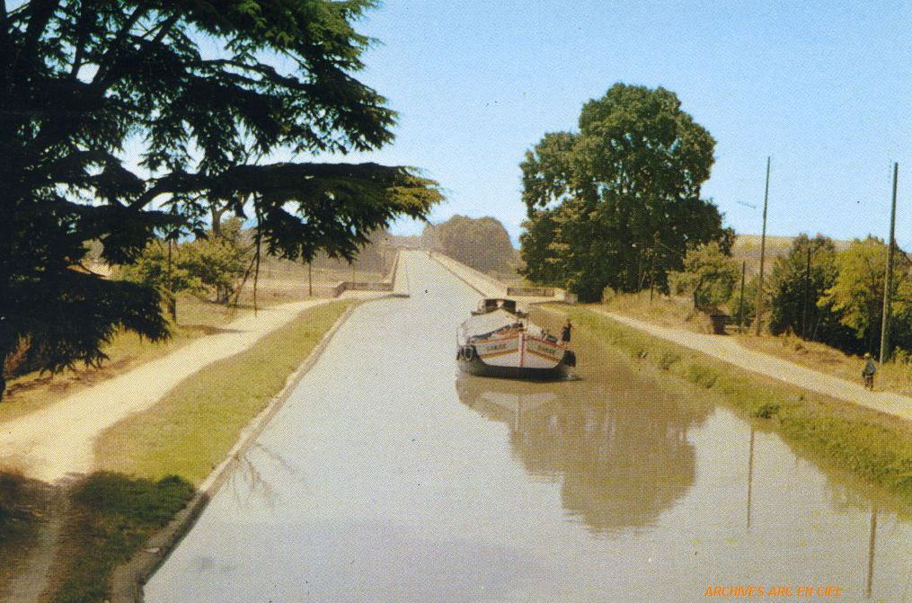 Il sort de l’écluse de Fresquel double et va s’amarrer au quai pour charger de la matte provenant de la mine d’or de Salsigne.